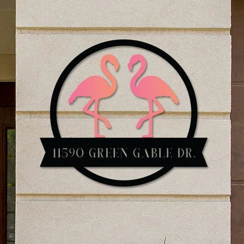Enhance your space with our vibrant address sign featuring colorful flamingos, suitable for both indoor and outdoor use. Crafted from sturdy 16-gauge steel and finished with premium-grade paint, this sign offers long-lasting durability and can withstand various weather conditions. Ideal for adding a decorative touch to any room or garden, this address sign is both functional and visually appealing.