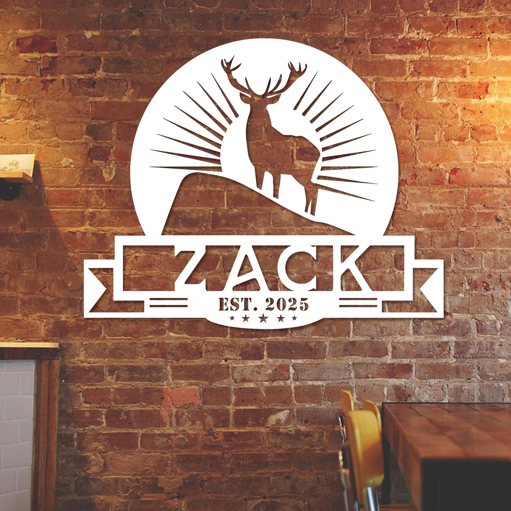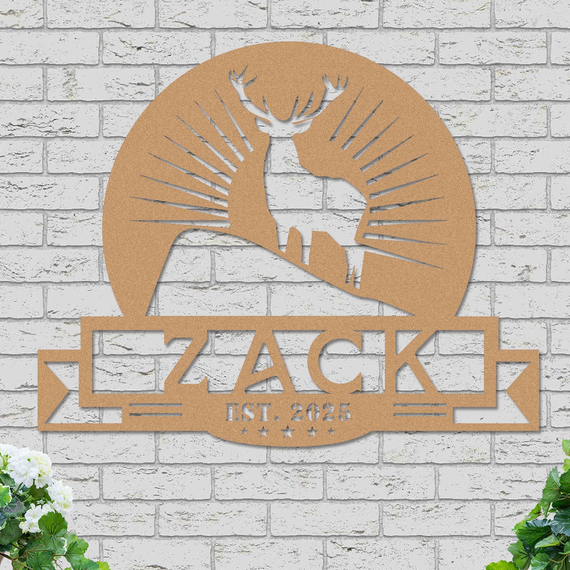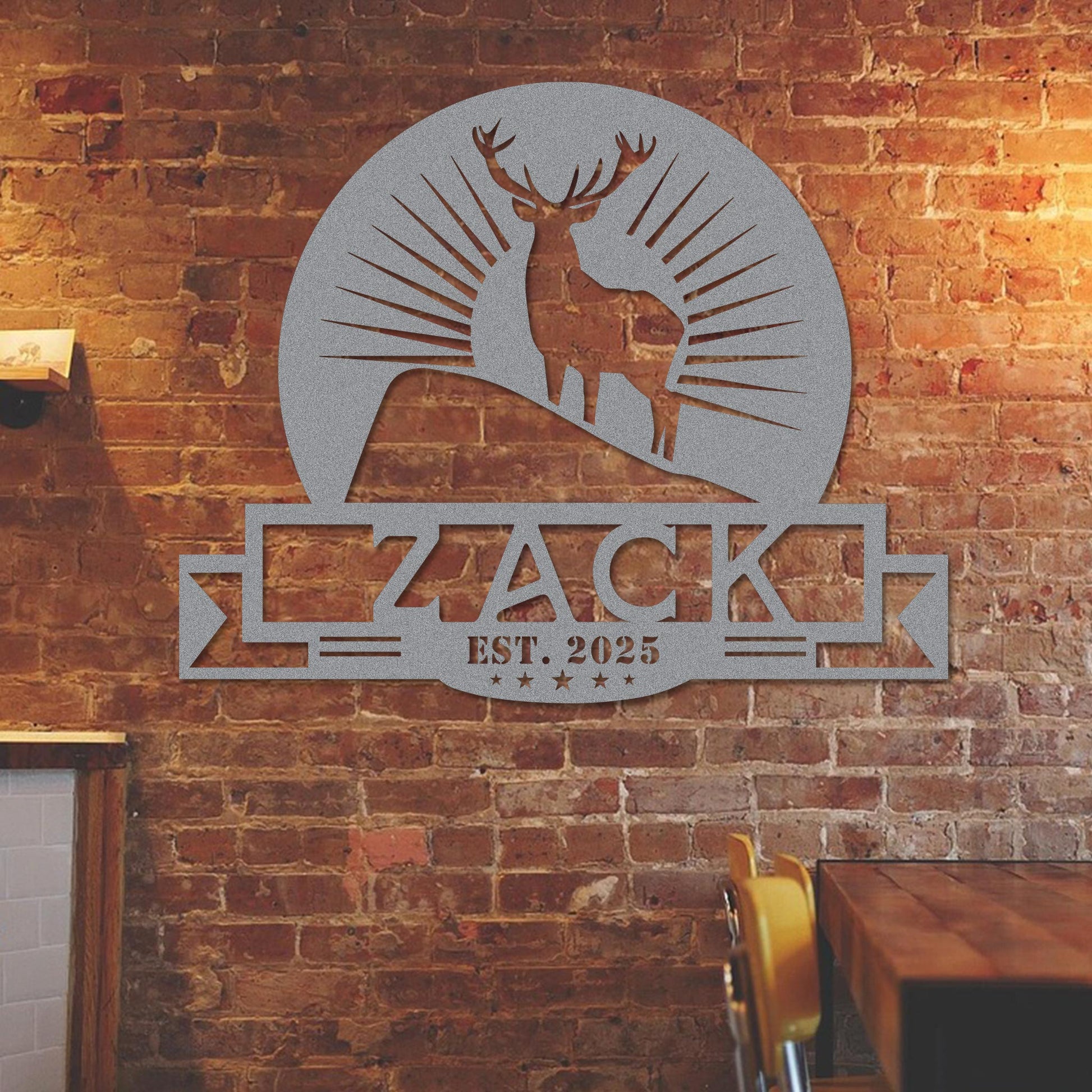 Transform your surroundings with our custom-designed piece that features a delightful deer and sunburst motif, ideal for both indoor and outdoor settings. Made from robust 16-gauge steel, this item is finished with high-quality paint that enhances its durability and maintains its vibrant colors over time. Its rustic elegance brings a personal touch to any room, making it a perfect addition to your home decor.