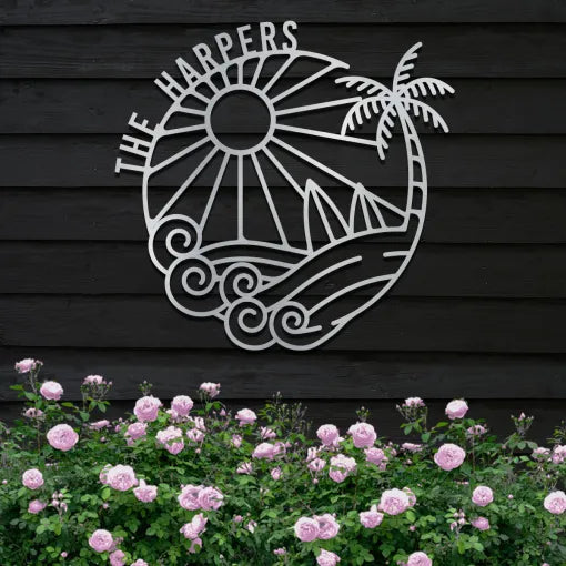 The Island Sunset Surf Circle Name Sign is a versatile decor piece suitable for both indoor and outdoor use. Crafted from durable 16-gauge steel, this sign is designed to withstand the elements, ensuring it retains its vibrant colors over time. Each sign is finished with premium-grade paint, which not only enhances its aesthetic appeal but also protects it for long-lasting enjoyment.